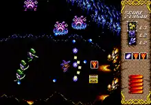 Controlling Saria is done with the controller's directional pad, which moves the player character in eight directions. Pressing the A button activates the magic bomb, while B is used to shoot and C allows to change between different magic attacks in real-time. After completing a stage, the player's total health is increased, as the Saria starts off with a three-bar life gauge. Once all health is lost, the players have a limited number of continues to keep playing before the game is over. If the game is completed on the highest difficulty, an extra difficulty level is unlocked at the options menu.
