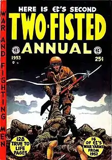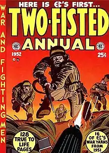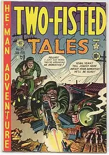 Two-Fisted Tales is an anthology war comic published bi-monthly by EC Comics in the early 1950s. The title originated in 1950 when Harvey Kurtzman suggested to William Gaines that they publish an adventure comic. Kurtzman became the editor of Two-Fisted Tales, and with the dawn of the Korean War, he soon narrowed the focus to war stories.[1] The title was a companion comic to Frontline Combat, and stories Kurtzman wrote for both books often displayed an anti-war attitude. It returned to adventure-themed stories in issues #36 through #39, co-edited by John Severin and Colin Dawkins, with a cover-title change to The New Two-Fisted Tales.
