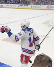 On March 21, 2022, Motte was traded to the New York Rangers at the trade deadline in exchange for a fourth-round draft pick in the 2023 NHL Entry Draft.[42] He had 15 points in 49 games with the Canucks that season, playing on Vancouver's penalty kill unit.[43] He did not score a point with the Rangers in nine games, but registered two goals in 15 playoff games[44] before the Rangers were knocked out by the Tampa Bay Lightning in the Eastern Conference Final.[45]