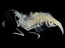 There are currently 17 recognized species, of which one is listed by the IUCN as critically endangered (marked "CR" below), and six are considered vulnerable (marked "VU").[4] Phylogenetic studies indicate that the genus as presently defined is paraphyletic and needs to be redefined, as T. galapagensis clusters with the widespread Antecaridina and T. monae likely with the Australian Stygiocaris. On a higher level, these three genera, together with Halocaridina and Halocaridinides, form a group.[2] In addition to the species below, "Typhlatya" jusbaschjani (Georgia) and "Typhlatya" pretneri (Hercegovina) have been listed in this genus, but the former is a species inquirenda and recent authorities generally include the latter in Troglocaris.[5][6]