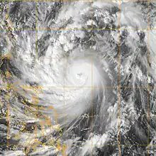 The JTWC estimated Cimaron to have been a stronger system, attaining its peak intensity as a Category 5-equivalent super typhoon with one-minute winds of 260 km/h (160 mph).[5][nb 5] However, satellite estimates from forecasters within the agency itself, the National Oceanic and Atmospheric Administration's Satellite Analysis Branch (SAB), the Air Force Weather Agency (AFWA), and Dr. Karl Hoarau of Cergy-Pontoise University stated Cimaron to have been an even stronger system. Using the Dvorak technique – a method of determining a tropical cyclone's intensity based on satellite appearance – AFWA and SAB yielded a peak value of T7.5, 285 km/h (177 mph), while advanced operational values from the JTWC peaked at T7.8, 305 km/h (190 mph). Additionally, a forecaster at SAB noted that the lower estimates were likely due to restrictions on the Dvorak technique stemming from Cimaron's rapid intensification. The forecaster also noted that a second type of estimate gave a maximum value of T8.0, 315 km/h (196 mph), the highest rating on the scale.[1]