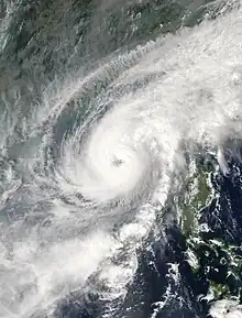 Typhoon Cimaron, known in the Philippines as Super Typhoon Paeng, was the most intense tropical cyclone to strike the Philippine island of Luzon since Typhoon Zeb in 1998.[1] Originating from a tropical depression on October 25, Cimaron developed within an environment strongly favoring tropical cyclogenesis east of the Philippines. On October 28, the system underwent rapid intensification, culminating in attaining its peak strength with winds of 185 km/h (115 mph). Estimates from the Joint Typhoon Warning Center ranked the system as a Category 5-equivalent super typhoon with one-minute sustained winds of 260 km/h (160 mph), though this is argued to have underrepresented the typhoon's strength. The system moved ashore near Casiguran, Aurora in northern Luzon at peak strength. Crossing the island, Cimaron emerged over the South China Sea where conditions allowed for temporary reorganization. After becoming nearly stationary on November 1, the typhoon executed a tight anti-cyclonic loop and rapidly weakened. The storm degenerated into a tropical depression on November 4, before dissipating three days later off the coast of Vietnam.