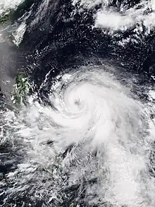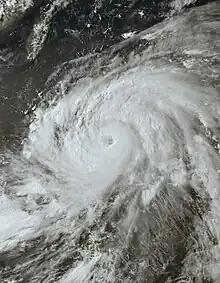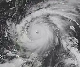 At 09:00 UTC on July 23, Doksuri began to rapidly intensify as it reached typhoon status over the Philippine Sea.[8][9][10] Its rapid intensification is attributed to a lack of vertical wind shear affecting the cyclone whilst moving over very warm (29–30 °C, 84–86 °F) ocean waters.[9] Satellite imagery showed the development of an eye-like feature, which was fully defined by 03:00 UTC on July 24.[9][11] Over 24 hours, its maximum sustained wind speeds grew by 30 knots (56 km/h; 35 mph) and eventually reached a peak of 100 knots (190 km/h; 120 mph).[12][13] At 21:00 UTC, the JTWC upgraded the system into a 'super typhoon'—its highest storm category—after Doksuri attained 1-minute sustained winds of 130 knots (240 km/h; 150 mph).[14]