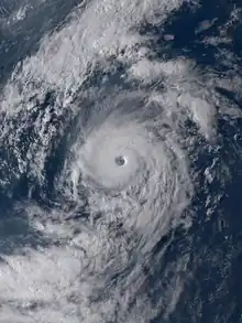 While the typhoon was moving westward toward the Philippine island of Luzon, thunderstorms in the northern eyewall deteriorated as a result of unfavorable subsidence from a high pressure system to the north.[11][12] Early on August 18, the Philippine warning center PAGASA began national advisories on the typhoon, giving Goni the local name Ineng.[13] On the next day, the typhoon rounded the subtropical ridge, co-existing with Typhoon Atsani, which developed concurrently over the western Pacific Ocean to the east.[14][15] On August 21, Goni's movement became nearly stationary about 100 km (62 mi) off the northern coast of Luzon. Land interaction weakened the typhoon's convective core until a building ridge to the southeast drove Goni northeastward and allowed convection to redevelop.[3][16][17] A new eye developed on August 23 as Goni passed east of Taiwan. The eye crossed over Iriomote-jima and Ishigaki, both part of the southern Ryukyu Islands.[18][19] Late on August 23, Goni attained its peak intensity with JMA-estimated peak winds of 185 km/h (115 mph).[3]