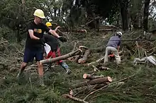 According to the catastrophe modeler Eqecat, the storm was likely to cause $1–3 billion (USD) in damage throughout the country.[31] However, as of September 3, officials have estimated that damage has reached 68.52 billion won (US$58.3 million).[25][27][32] In the wake of the storm, the Korean disaster agency stated that 29,000 government officials, soldiers and volunteers were working on clearing debris and restoring power.[28] By the evening of September 2, electricity had been restored to 98% of the households affected.[30] Roughly $22 million (USD) was set aside as relief money for residents affected by the storm. The National Tax Service decided to allow extra time on deadlines for people to recover.[33]
