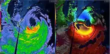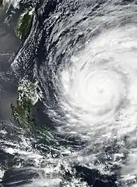 On May 23, Mawar rapidly intensified to winds of 215 km/h (130 mph), equivalent to Category 4 strength on the Saffir–Simpson hurricane wind scale (SSHWS). Furthermore, Mawar underwent an eyewall replacement cycle.[22] But despite usually causing the storm to weaken, the typhoon strengthened even further into a super typhoon, the highest classification of strength from the JTWC, after reaching winds of 250 km/h (155 mph).[23] On May 24, the center of Mawar passed about north of the northern tip of Guam as a Category 4-equivalent typhoon with maximum sustained winds up to 140 mph with gusts up to 165 mph, around 9 p.m. local time and slightly weakened.[24][25][26] On May 25, the aforementioned eyewall replacement cycle had been completed, and a uniform eye had appeared. Initially cloud-filled, the storm quickly cleared it out and continued strengthening slowly as it moved west-northwestward.[27] By the next day, Mawar reached its peak intensity, attaining 1-minute sustained winds of 295 km/h (185 mph) according to the JTWC, which is equivalent to Category 5 strength on the SSHWS.[28] It also had 10-minute sustained winds of 215 km/h (130 mph) and a minimum central barometric pressure of 900 hPa (26.58 inHg) which was assessed by the JMA.[29] While being large and symmetrical, Mawar again went through another eyewall replacement cycle,[30] resuming its weakening trend from the process. However, its concentric eye still remained large throughout the procedure.[31] By 18:00 UTC of May 26, Mawar entered the Philippine Area of Responsibility (PAR), and PAGASA hence assigned it the name Betty.[32]