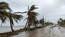 Mawar caused a warehouse to collapse which is the only reported damage, there was one person who suffered a minor injury was reported.[113][114] The NDRRMC reported 104,305 affected people.[4] In addition, 11 houses were destroyed and 91 others were damaged.[4][115] A storm surge caused by Mawar destroyed parts of the coastal town of Baler, Aurora, causing some residents to lose their homes.[116] Mawar caused power outages in parts of Cagayan.[113] Over 40 nipa huts from the Aeta village in San Luis, Aurora, were destroyed by the strong winds.[113] Some tourists are stranded on the island of Batanes.[117]