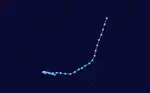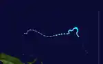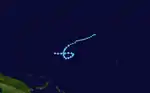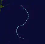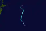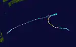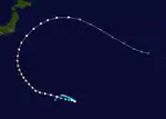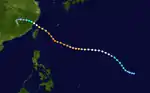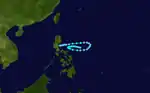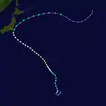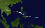 A tropical disturbance generated by an upper tropospheric low in the mid-Pacific trough moved westward through the Caroline Islands, slowly organizing into Tropical Depression 1W on January 5. The depression quickly strengthened, reaching tropical storm status later that day and becoming a typhoon on the 6th as it neared the Philippines. Kit rapidly intensified on the 6th and 7th to a 140 mph (230 km/h) typhoon, the strongest ever in January, but its inflow was cut off to the west, weakening the typhoon as it continued westward. Kit hit the eastern Philippines as a 100 mph (200 km/h) typhoon on January 7, and turned north through the archipelago in response to a break in the subtropical ridge. This brought Kit eastward then southward, where after completing its large loop it dissipated on January 15, just 170 nautical miles (310 km) from its starting location.[2]