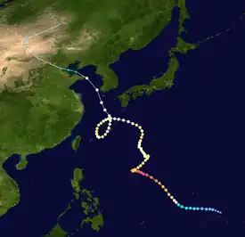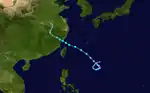 A disturbance in the ITCZ became a tropical depression on July 5. It headed northwest over the Philippines. It intensified into a tropical storm almost immediately after entering the South China Sea on July 8. It then turned north, and erratically drifted and looped for four days. On July 11, Susan became a typhoon. On July 14, Susan moved close to the Taiwan Strait. It made landfall on the coast of Fujian province, and dissipated inland on July 15.[8]