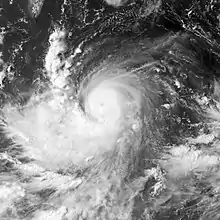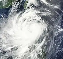 Nanmadol continued to drift north west and made landfall over Gonzaga, Cagayan, Philippines with strong winds of over 95 knots (176 km/h; 109 mph).[14] After interacting with land, the eye of Nanmadol became cloud filled and the eyewall in the northern semicircle became eroded causing the system to weaken.[15] However, the typhoon maintained tightly curved convective banding and central convection for long time after the landfall. The typhoon maintained a favorable upper level outflow, though located in a mid-level subtropical ridge.[16] As Nanmadol started moving away from Luzon, the eye became more evident and central convection became re-consolidated with curved banding.[17] However, the typhoon did not maintain this for long. Nanmadol could not recover very well from interacting with land and started weakening as the cloud tops were warming up and the eye was being filled with clouds again.[18] During the early hours of August 28, Nanmadol struggled to strengthen after passing over the Babuyan Islands. The eye became completely cloud-filled and the outermost rainbands crossed over Taiwan.[19] This prompted the JMA to downgrade Nanmadol to a severe tropical storm.[20] Later that day, the central convection started depleting as the system approached southern Taiwan. At that time, it was located approximately 245 nautical miles (454 km; 282 mi) south of Taipei in the periphery of a mid-level subtropical ridge.[21] Nanmadol continued to weaken as it approached Taiwan and the winds rapidly decreased to under 75 knots (139 km/h; 86 mph) (1-minute sustained), making Nanmadol a minimal typhoon on the SSHS. It maintained a poorly defined eyewall to its south with convective banding wrapped into the cloud filled center.[22]