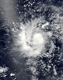 On July 9, the United States Joint Typhoon Warning Center (JTWC) started to monitor a tropical disturbance, that had developed to the east of the Micronesian State of Chuuk.[20] At this time the system had a broad and ill-defined circulation center which was associated with flaring and disorganized atmospheric convection.[20] Over the next day the system gradually consolidated within an area of favorable conditions, with convection wrapping around the systems obscured low level circulation center.[21] The system was subsequently declared a tropical depression during the next day, by both the Japan Meteorological Agency (JMA) and the JTWC with the latter assigning it the designation 09W.[22][23]