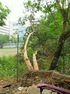During July 23 and 24, Typhoon Vicente's rainbands brought heavy squally showers to Hong Kong, during which over 200 mm (7.9 in) of rainfall was recorded over many parts of the territory, while a maximum storm surge of about 1.51 metres (5.0 ft) was recorded at Tsim Bei Tsui.[25] In Hong Kong, at least 138 people were injured during the passage of Vicente.[25] The number of fallen trees amounted to about 8,800.[25] There were two reports of landslip and 7 reports of flooding.[25] Dangerous signboards or fallen scaffoldings were reported in many parts of the territory, resulting in closure of some roads and damage to many vehicles.[25] A wooden board was blown up by strong winds in Connaught Road Central, hitting a number of passers-by and knocking one of them unconscious.[25] During the storm, the East Rail line of the Mass Transit Railway had to halt service because of damage of overhead cables by toppling trees.[25] As a result, hundreds of commuters were forced to spend the night in trains or at the MTR stations. Crops were damaged by flood waters in some farmlands in Sheung Shui.[25] A small craft ran aground in Deep Water Bay and was damaged.[25]