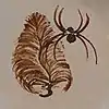 Tyra signs her pots with a feather and a spider glyph. The feather represents her lineage to the Naha family through her grandmother, who signed with a feather glyph. The spider is her clan symbol.