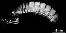 Some of the known specimens of Tyrannosculda appear to represent different growth stages of the animal, ranging from early juveniles to adults, though there is not currently enough known material to reconstruct the entire growth sequence. In younger individuals, the tergites on the upper surface become shorter and more tapering the further they are from the head, whereas in late juveniles and adults, the tergites all have similar dimensions.[1]
