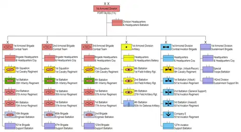 The 1st Armored Division, nicknamed "Old Ironsides",[1] is a combined arms division of the United States Army. The division is part of III Armored Corps and operates out of Fort Bliss in El Paso, Texas. It was the first armored division of the United States' Army to see battle in World War II. Since World War II, the division has been involved in the Korean War, Cuban Missile Crisis, Persian Gulf War, Iraq, Afghanistan, and several other operations. The division has also received numerous awards and recognition.