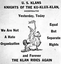 The U.S. Klans, officially, the U.S. Klans, Knights of the Ku Klux Klan, Inc. was the dominant Ku Klux Klan in the late 1950s and early 1960s. The death of its leader in 1960, along with increased factionalism, splits and competition from other groups led to its decline by the mid-to-late 1960s.[1]