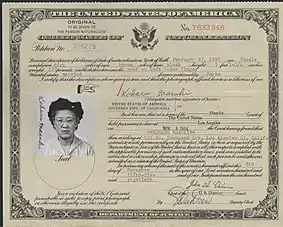 Amendments to the Cable Act and nationality laws continued until 1940, when married women were granted their own nationality without restriction.[58] That year, Congress amended the Nationality Act, distinguishing for the first time different rules for derivative nationality for legitimate and illegitimate children.[59] Under the provisions, children born out of wedlock passed from mother to child automatically, but required legitimization of paternity prior to a child reaching the age of majority for derivative nationality from the father.[56] The 1940 Act also allowed all women who had previously lost their citizenship because of marriage to repatriate without regard to their marital status, by swearing the oath of allegiance, as opposed to the previous policy of repatriation by naturalization.[60] Racial exclusions for derivative naturalization of husbands of U.S.-citizen wives remained in place until passage of the McCarran-Walter Act in 1952. Though it ended utilizing race as a criterion for admission to the country of nationalization, continued use of quotas to restrict immigration from Asian countries did not end racial exclusion.[61][62] Until immigration laws were reformed by the Immigration and Nationality Act of 1965, the restrictive quota system remained in place.[61]