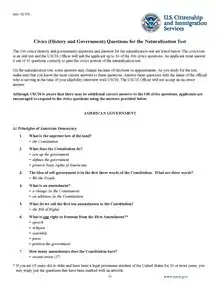 Applicants must apply for naturalization with the United States Citizenship and Immigration Services and pay requisite fees.[119] They must demonstrate good moral character, evidenced by a lack of a criminal history, and must pass a test on United States history and civics. The questions are publicly available on the web and require the applicant to answer ten out of one hundred possible questions.[114] Most applicants must also have a working knowledge of the English language, demonstrated by testing their basic ability in reading and writing, rather than fluency. Long-term permanent residents are exempt from the language test. For example, a person who is over age fifty with twenty years of residency or over fifty-five with fifteen years of residency can opt to take the civics test in their original language. Persons over age sixty-five with twenty years residency may be given a shorter list of questions and those with physical or mental disadvantages are exempt from either the language or civics examinations.[114] Granting of nationality is contingent upon taking an Oath of Allegiance; however since 2000 an exception has been made for people with diminished physical or mental capacity.[114]