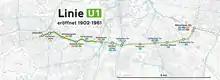 U1 is a line on the Berlin U-Bahn, which is 8.8 kilometres (5.5 mi) long and has 13 stations. Its traditional line designation was BII. It runs east–west and its eastern terminus is Warschauer Straße S-Bahn station where it connects to the Schlesische Bahn. From there it runs through Kreuzberg via Gleisdreieck and Wittenbergplatz on to the Kurfürstendamm.