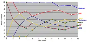 - UST clinched the #1 seed and the twice to beat advantage at the semifinals with a better points difference (+35) against FEU (–13) and Ateneo (–22)