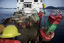 The buoy deck has 1,335 square feet (124.0 m2) of working area. A crane with a boom 42 feet (13 m) long lifts buoys and their mooring anchors onto the deck. The crane can lift up to 20,000 pounds (9,100 kg).[6]