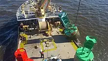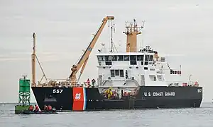 Frank Drew's buoy tending involves lifting them onto her deck where marine growth is scraped and pressure washed off, inspecting the buoy itself, and replacing lights, solar cells, and radar transponders. The mooring chain or synthetic cable is inspected and replaced as needed. The concrete block mooring anchor is also inspected. Aside from this routine maintenance, intense storms along the Atlantic coast create additional work for Frank Drew. For instance, Hurricane Florence displaced nearly 200 buoys in North Carolina, and the ship was one of the Coast Guard vessels which reset them in their proper locations.[20] Emergency maintenance is also required when accidents damage or sink buoys. In 2016, for instance, a buoy near the Chesapeake Bay BridgeTunnel was hit by a vessel under tow and disappeared. The channel was closed to deep-draft shipping until a team, including Frank Drew, could assess the situation.[21] Seasonal exchanges between large summer buoys and simpler buoys with ice-resistant hulls is also required on rivers prone to freezing.[22]