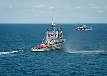The Naval Air Weapons Command leased Narragansett to CSC Corporation, which in turn, subleased the vessel to Donjon Marine Company, Incorporated.[18] Donjon Marine was also the lessee of a sister ship, Powhatan. The company was responsible for crewing, maintenance, and operations of the ship.[19] Narragansett was used to tow ex-Tripoli to various points in the Pacific where she launched missiles as part of the development and testing programs for the THAAD ballistic missile defense program, the Navy's sea-based terminal missile defense program, and the Israeli Arrow missile program.[20][21] During this period, Narragansett and ex-Tripoli were based at Pearl Harbor, Mare Island,[22] and finally Pier 80, San Francisco.