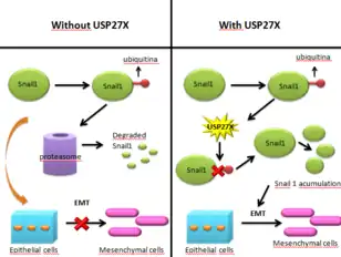 Cancerous cells gain the ability to migrate towards other parts of the body and to invade other tissues through what is called epithelial-mesenchymal transition. This process consists of a series of biochemical changes that transform an epithelial polarized cancerous cell into a cell with a mesenchymal phenotype. This new phenotype gives the cell an increased ability to migrate and invade other tissues, while it also decreases apoptotic activity. Therefore, EMT allows the cancerous cell to abandon the epithelial layer in which it originated, and migrate to other tissues. This is how metastasis in epithelial cancer begins.[15] EMT is controlled by various mesenchymal markers, amongst them Snail1, a protein also necessary in the activation of cancer associated fibroblasts (CAF). In a normal epithelial cell, Snail1 is continuously degraded by proteasomes, due to its previous ubiquitination. However, in cancer cells and CAFs, Snail1 degradation is prevented. One of the mechanisms that cancerous cells use to do so is USP27X. This protein deubiquitinates Snail1, meaning it cannot be degraded, therefore causing it to stabilize and to activate EMT, allowing metastasis. In cancerous cells, USP27X is regulated by TGFβ, and, summarizing, it causes the stabilization of Snail1 and other mesenchymal markers, leading to EMT. Although USP27X is not the only deubiquitinase that affects Snail1, it is one of the most effective and it has been proved to directly increase Snail1 presence by preventing its degradation. USP27X mechanism was observed in breast and pancreatic cancers, therefore opening a new door for treatments. Inhibition of USP27X would cause Snail1 to be ubiquitinated and then degraded, and therefore it would impair EMT.[16]