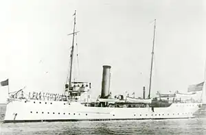 The United States Revenue Cutter Service cutter Algonquin was planned and designed by RCS officers and laid down in 1897 at the Globe Iron Works's yard in Cleveland (yard number 71) and launched on 30 March 1897.[4] Algonquin was a steel-hulled vessel equipped with a triple-expansion steam engine, Scotch boilers, and a single screw. She was one of the first RCS cutters built with electric generators to supply current for lights and call bells.[5][6] She was one of the last RCS cutters that was rigged for sails and had a bow torpedo tube installed.[7][8] Before Algonquin could be completed, she was transferred to U.S. Navy control on 24 March 1898 due to the Spanish-American War. The ship was cut in half and moved to Ogdensburg, New York.[Note 1] Algonquin was reassembled at Montreal, Canada and served briefly in coastal service. On 17 August 1898 the Algonquin was returned to the Treasury Department.[5]