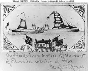 ![]() USS Adela (1863–1865) Drawing by George H. Rogers, depicting the ship "on blockading service off the coast of Florida, winter of 1863". The artist served on board Adela as a Pharmacist's Mate. | |