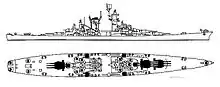 The ship was armed with a main battery of nine 12 in (305 mm) L/50 Mark 8 guns in three triple gun turrets, two in a superfiring pair forward and one aft of the superstructure.[lower-alpha 1] The secondary battery consisted of twelve 5 in (127 mm) L/38 dual-purpose guns in six twin turrets. Two were placed on the centerline superfiring over the main battery turrets, fore and aft, and the remaining four turrets were placed on the corners of the superstructure. The light anti-aircraft battery consisted of 56 quad-mounted 40 mm (1.6 in) Bofors guns and 34 single-mounted 20 mm (0.79 in) Oerlikon guns.[1] A pair of Mk 38 gun directors aided gun laying for the main battery,[5] while two Mk 37 directors controlled the 5-inch guns and a Mk 57 director aided the 40 mm guns.[6]