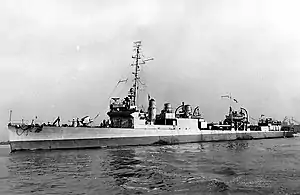 At Fort-de-France, she was fitted with a wooden bulkhead to cover the area blown off by the torpedo, and an anchor was improvised out of a truck's axle and differential housing. She then sailed under her own power to San Juan, Puerto Rico where a steel stub bow was attached. From there, the steamed for Philadelphia Naval Yard for permanent repairs. During mid-1942, Blakeley was fitted with the forward section of her decommissioned sister ship, Taylor.[10] She was also fitted with newer weapons and electronics systems, such as updated radar. Repairs were completed in September 1942 and she resumed her convoy duties in the Caribbean.[9]