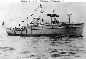 Bonita was built as a private pleasure craft by the Holmes Motor Company at Mystic, Connecticut. On 17 May 1917, the U.S. Navy acquired her from her owner, Mr. Robert Windsor of Boston, Massachusetts, for use as a section patrol vessel during World War I. She was commissioned as USS Bonita (SP-540) soon thereafter.