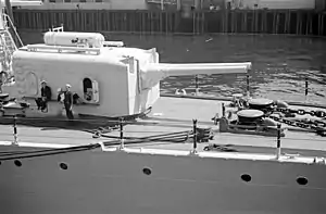 During her career Cincinnati went through several armament changes. Some of these changes were to reduce weight, but others were to increase her AA armament. On 8 September 1926, the Chief of Naval Operations, Admiral Edward W. Eberle, along with the Commanders in Chief of the United States Fleet and Battle Fleet, and their subordinate commanding officers, the Secretary of the Navy, Curtis D. Wilbur, ordered that all mines and the tracks for laying the mines be removed from all of the Omaha-class cruisers, the working conditions had been found to be very "wet". Another change made before the war was to increase the 3-inch guns to eight, all mounted in the ship's waist. After 1940, the lower aft 6-inch guns were removed and the casemates plated over for the same reason as the lower torpedo mounts. The ship's AA armament were originally augmented by three quadruple 1.1-inch (28 mm)/75 gun mounts by early 1942, however, these didn't prove to be reliable and were replaced by twin 40-millimeter (1.57 in) Bofors guns along with 14 20-millimeter (0.79 in) Oerlikon cannons by the end of the war.[4] It was reported that Cincinnati also mounted a pair of Army 40mm Bofors guns.[7]