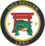 USS Denver (LPD-9), an Austin-class amphibious transport dock, was the third ship of United States Navy to bear this name. Denver's keel was laid on 7 July 1964 at Lockheed Shipbuilding and Construction Company, Seattle, Washington. She was launched on 23 January 1965, christened by Mrs. Ann Daniels Love, wife of John A. Love, the former governor of Colorado, and commissioned on 26 October 1968. After 46 years of service, Denver was decommissioned at Joint Base Pearl Harbor–Hickam on 14 August 2014. At the time of her decommissioning, Denver was the oldest deployable warship in the U.S. Navy, and was one of the last active warships to have served in Vietnam.