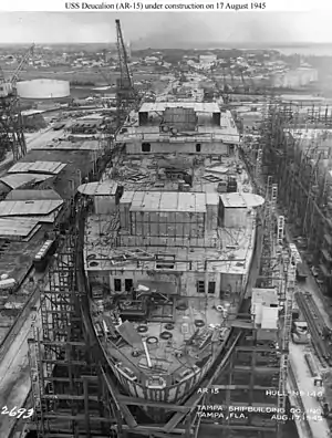 USS Deucalion (AR-15) was the third ship of the Amphion-class of repair ship built for the United States Navy by Tampa Shipbuilding Company during World War II.[1] Named after Deucalion the mythological king of Thessaly, her keel was laid down on December 15, 1944, but her construction was canceled on August 12, 1945, shortly after the Atomic bombings of Hiroshima and Nagasaki.[2]
