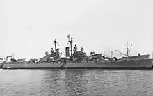 USS Duluth was a Cleveland-class light cruiser of the United States Navy, which were built during World War II. The class was designed as a development of the earlier Brooklyn-class cruisers, the size of which had been limited by the First London Naval Treaty. The start of the war led to the dissolution of the treaty system, but the dramatic need for new vessels precluded a new design, so the Clevelands used the same hull as their predecessors, but were significantly heavier. The Clevelands carried a main battery of twelve 6-inch (152 mm) guns in four three-gun turrets, along with a secondary armament of twelve 5 in (127 mm) dual-purpose guns. They had a top speed of 32.5 knots (60.2 km/h; 37.4 mph).