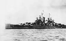 Duluth left Pearl Harbor on 8 May to join 5th Fleet, which she met on 27 May.[4] While cruising with the fleet off Okinawa on 5 June, Duluth was damaged by a severe typhoon, along with a number of other vessels.[5] She had to sail south to Guam for repairs, which lasted for more than a month. She returned to the Fast Carrier Task Force on 21 July, which had by that time passed to 3rd Fleet, being renamed Task Force 38.[4] Duluth was assigned to the subordinate unit Task Group 38.1, along with five aircraft carriers, three fast battleships, four other cruisers, and several destroyers.[6] She served as part of the anti-aircraft screen that protected the carriers as they carried out a series of air strikes on various targets in Japan. These operations continued until the end of the war on 14 August.[4]