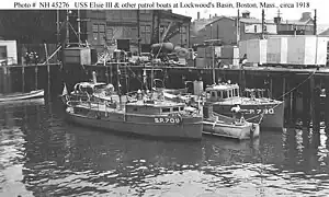USS Elsie III (foreground) at Lockwood's Basin in Boston, Massachusetts, during World War I. Behind her is the patrol vessel USS Lynx II (SP-730).