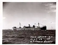 The ship returned to commercial service as SS Felix Taussig. During World War II, she was among 37 merchant ships escorted by eight warships in Convoy TAG 18,[7] a TAG convoy operating in the Caribbean on the route Trinidad-Aruba-Guantanamo Bay.[8] During its 2-8 November 1942 transit, the convoy came under attack by the German submarines U-129 and U-160, which sank six ships.[7] Felix Taussig′s embarked United States Navy Armed Guard received the American Campaign Medal with a battle star for service during the convoy battle.[9]