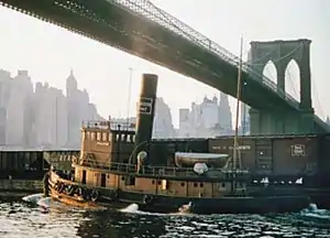 - Photo of tug Fulton with railcar barge under the Brooklyn Bridge, East River, New York Harbor - ca. 1952