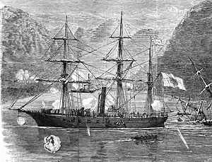 ![]() Alexandre Pétion, formerly USS Galatea, bombarding Petit Goave in 1868 | |
