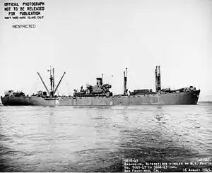 Towed back to San Francisco, her name was struck from the Navy List 1 August 1947, and she was returned to the War Shipping Administration (WSA) on 1 October 1947, and entered the National Defense Reserve Fleet at Suisun Bay, California.[3] She was sold on 19 March 1973, to Tung Ho Steel Enterprise Corporation, of Taiwan, for $137,000. She was delivered on 16 April 1973.[5]