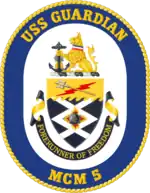USS Guardian (MCM-5) was an Avenger-class mine countermeasures ship of the United States Navy, and was the second Navy ship to bear that name. The hulls of the Avenger-class ships were constructed of wood with an external coat of fiberglass.