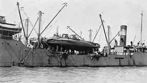 ![]() Off the Cavite Navy Yard, Philippine Islands, circa March 1915, with submarines A-3, A-5 and B-1 on deck, after transporting them out from the United States. - B-1 is on Hector's starboard side. The two A-boats are in the center and port side cradles. | |