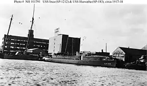 ![]() USS Hiawatha in the Norfolk, Virginia, area in 1917-1918. Patrol vessel USS Inca (SP-1212) is at left, bearing the Naval Aviation star insignia. | |