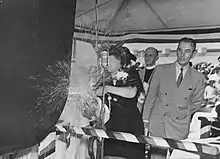 Mrs. Grizelda Houston Hull Hobson, widow of Rear Admiral Richmond P. Hobson, christens USS Hobson.