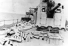 Expended cartridge cases and powder tanks from the ship's 5-inch/38 caliber guns litter the deck, after firing in support of the Normandy invasion off Utah Beach, 6 June 1944. This view was taken on the ship's afterdeck, with mount 54 at right.