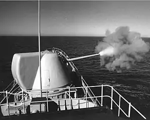 Hull's eight-inch gun began firing tests in April 1975. These lasted into the following year, and were reportedly successful. The ship carried the Mark 71 mounting during her 1976-77 and 1978 deployments to the Western Pacific, and conducted more firing tests during that time. However, the MCLWG project was cancelled in 1978. The prototype gun was removed from Hull during her 1979-80 overhaul[3] and she spent the rest of her days with the three five-inch gun mounts that were typical of her class.[4]