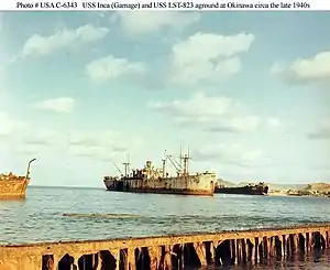 On 25 May 1945 she was damaged by an aircraft torpedo off Nakagusuku Wan, Okinawa, killing 8 crew members and wounding two. She was towed into port and declared a constructive total loss, not suitable for repair. On 25 July 1945, based on a recommendation from the local War Shipping Administration (WSA) official, the Chief of Naval Operations (CNO) authorized Commander Service Division (ComServDiv) 104 to accept the ship "as is" at Okinawa and place her in service for non-self propelled floating dry storage. ComServDiv 104 accepted her at Okinawa on 30 July and on 6 August the Secretary of the Navy (SECNAV) approved the name Inca and designator IX-229 for her. She was converted to a storage ship by USS Vestal (AR-4) and USS Zaniah (AG-70), and was in Buckner Bay, Okinawa, when typhoons struck on 16 September and 9 October 1945. During the September typhoon she was hit by a merchant ship and suffered topside damage that was considered repairable, and she continued to issue supplies to ships in the bay. During the October typhoon she broke adrift and was one of several ships that USS Nestor (ARB-6) reported nearly hit her as Nestor was inexorably being driven ashore. Inca went aground during the storm and remained aground afterwards, but plans to survey her in late October were canceled and she appears to have remained in service as a storage ship into December. [2]
